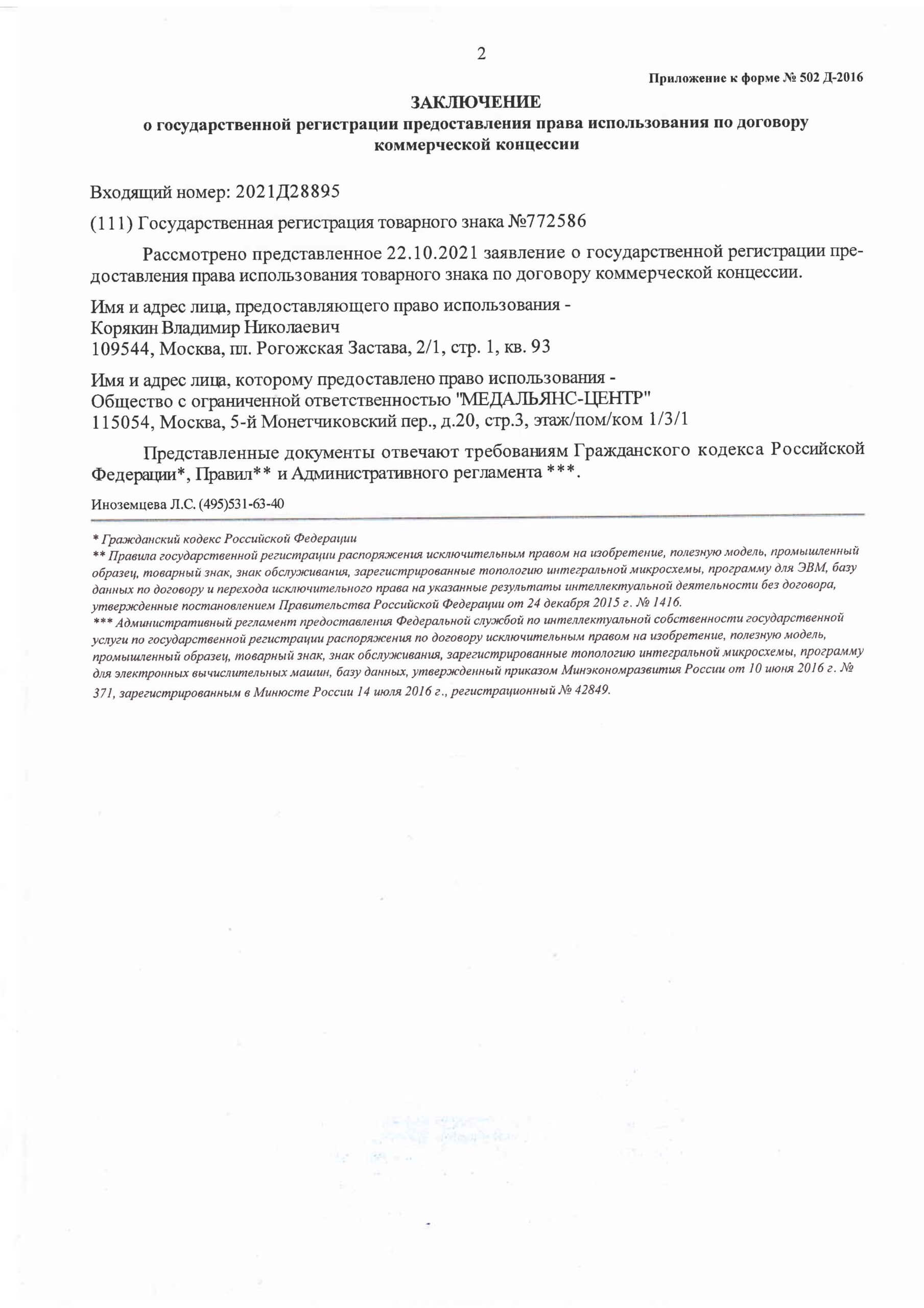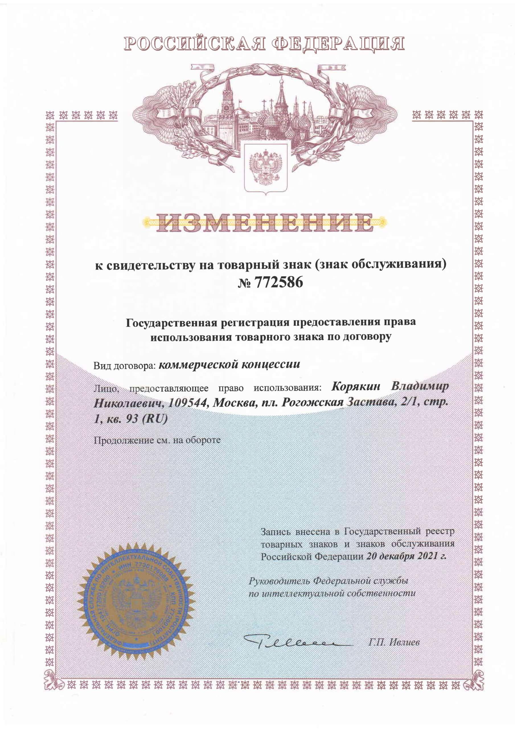 Уведомляю о государственной регистрации предоставления права использования товарного знака по договору коммерческой концессии.